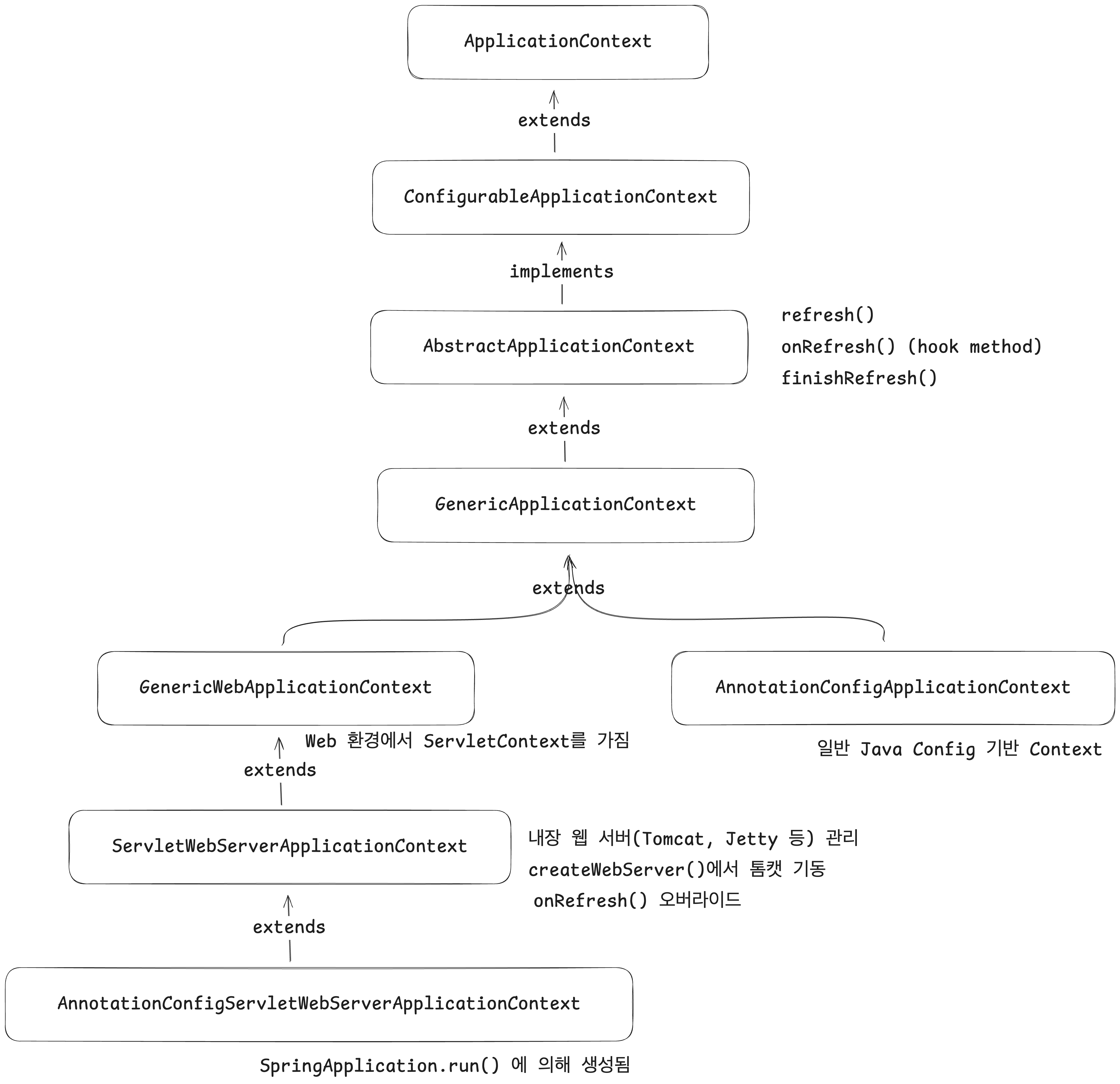 Spring Boot의 부팅 진입점은 위에서 언급했듯 SpringApplication.run(...)이다. 여기서 Spring Boot는 ApplicationContext를 직접 생성하고 관리한다.